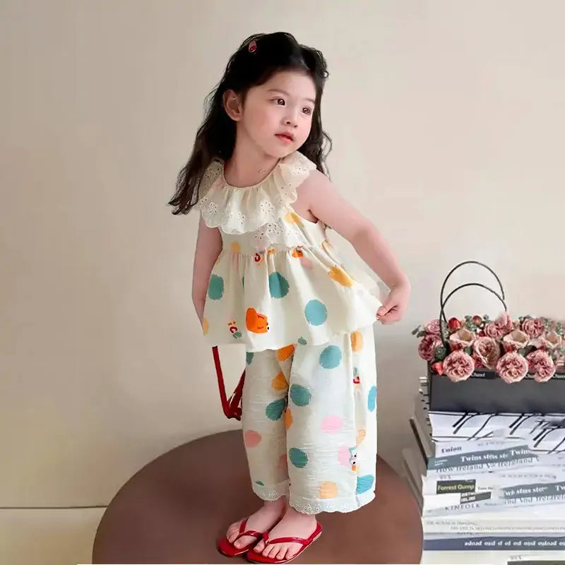 الصفحة الرئيسية اثاث طقم فتيات صيفي بدون أكمام بنطال دانتيل