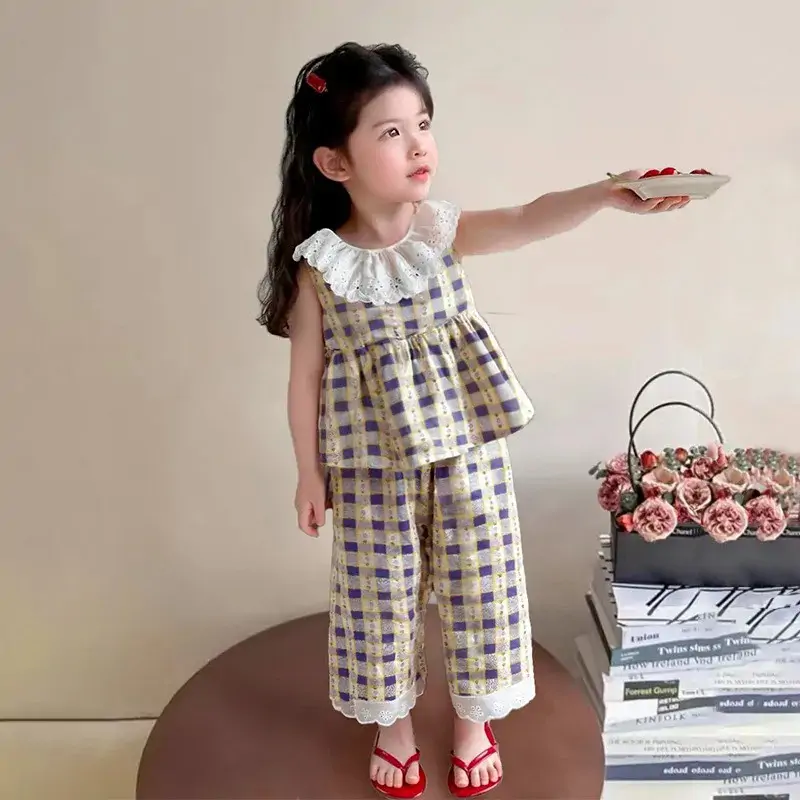 طقم فتيات صيفي بدون أكمام بنطال دانتيل